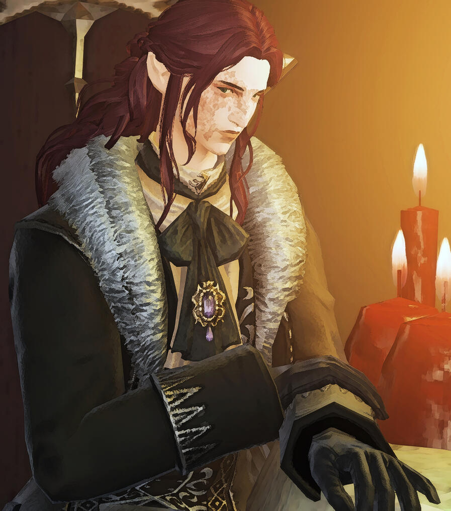 You step lightly into the dark and dim, something drawing you just down the hall, past a corner, through another set of ornate doors carved from sturdy lacquered ebonwood and the first thing your eyes drift to is a portrait hung sentry over a grand but cold hearth.The eyes of the man depicted radiate an aloof disdain not uncommon in Ishgardian nobility, but it is the small, nearly imperceptible lilt of melancholy in the slope of his brows and the set of his mouth that arrests you most.If you hold your breath and close your eyes, a mad part of you, the long-buried self of your winsome childhood that believed all of your mother's cradle tales, hears him weep.You gaze upon it and you know this is the Lord of the house.